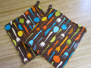 The potholders are made from the same fabric with a layer of Insul-Bright between them and quilted on the diagonal. I was thrilled with my new additions until I tried to take a loaf of banana bread out of the oven and burnt by fingers. I would advise TWO layers of insul-bright to anyone who wants to try their hand at potholders!